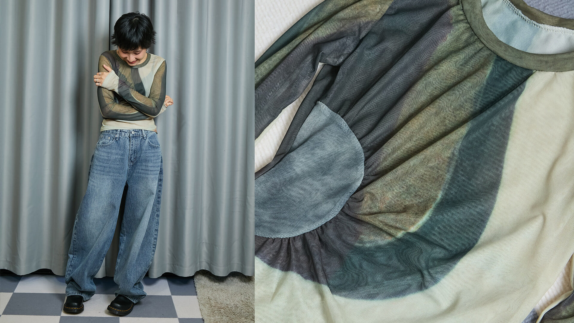 大地色系幾何切割塊狀渲染圓圈車縫圓領網紗上衣